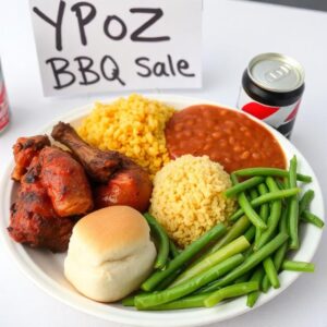 Dinners will consist of: BBQ Chicken or BBQ Ribs, Yellow Rice, Baked Beans, String Beans, Roll, Water or Soda.